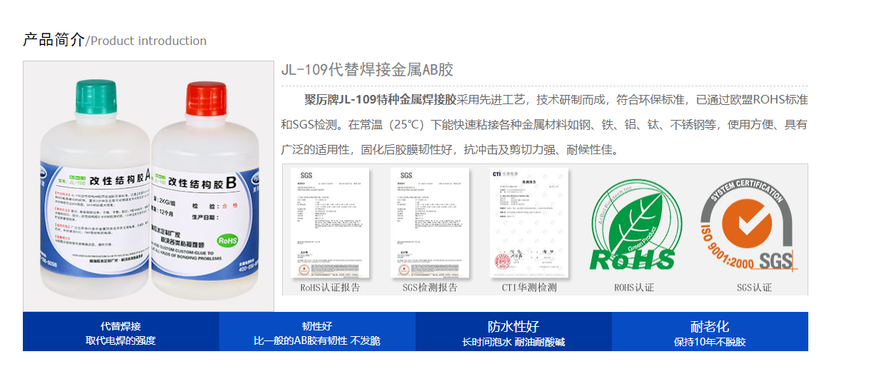 金属胶水厂家东莞聚力胶粘制品有限公司是一家科技企业,曾为世界500强企业华为提供技术服务。聚厉牌金属胶水初步固化时间5-10分钟,1小时可以达到高强度,24小时后完全固化,强度比传统水电焊更高,用过这款强力金属粘合剂的人都表示以后不会再用麻烦又费钱的焊接方式,用粘金属胶粘剂来进行粘接的方式更方便效果更好。聚力公司生产的粘金属专用胶水质量有保障,售后无忧,供货稳定,提供免费试样服务,可免费为客户提供解决方案。聚厉牌金属胶水广泛适用于机械制造行业,机电行业、化工行业、汽车制造行业等领域。东莞聚力公司从业经验丰富,可根据不同客户需求,不同材质特点,特殊调制定制出符合客户使用标准的各种代替焊接的金属粘合剂。欢迎拨打4000568098和0769-23198592联系聚力技术人员,聚力团队一定会满足您的需求。