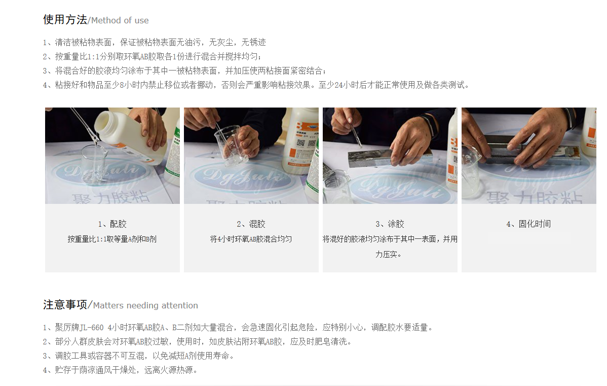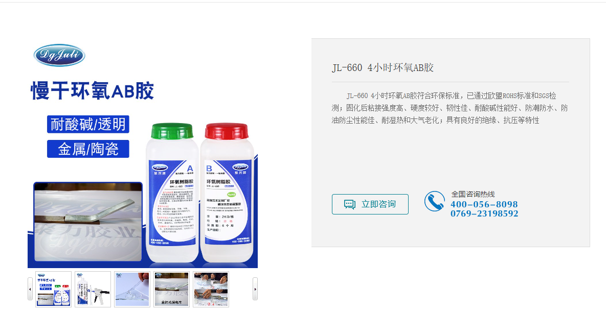 江苏省苏州市客户王经理打电话给AB胶厂家东莞聚力胶粘公司,他说自己正在找一款室温固化较长工作时间,有一定防火性能的环氧树脂AB胶,要求特别适用于电器,玩具,五金,饰品,塑胶,木材,皮革等材质的粘接。聚力公司推荐了聚厉牌JL-660 4小时环氧树脂AB胶,这款AB胶为透明粘稠状环氧树脂粘接剂,可低温或常温固化,用于金属、陶瓷、木材、玻璃及硬质塑胶之间的封装粘接。广泛应用于电子电气、工艺礼品、石油化工等行业。聚厉牌4小时环氧AB胶符合环保标准,已通过欧盟ROHS标准和SGS检测。固化后粘接强度高、硬度较好、韧性佳、耐酸碱性能好、防潮防水、防油防尘性能佳、耐湿热和大气老化、具有良好的绝缘、抗压等特性。现将聚厉牌4小时环氧AB胶简单介绍如下: