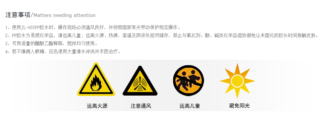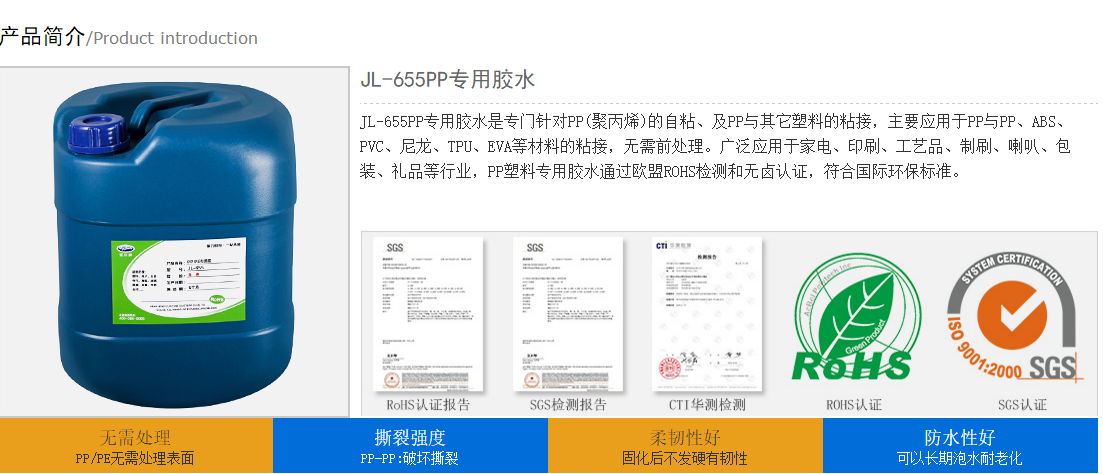 聚厉牌JL-655粘PP胶水是专门针对PP(聚丙烯)的自粘、及PP与其它塑料的粘接,主要应用于PP与PP、ABS、PVC、尼龙、TPU、EVA等材料的粘接,无需前。广泛应用于家电、印刷、工艺品、制刷、喇叭、包装、礼品等行业,PP塑料专用胶水通过欧盟ROHS检测和无卤认证,符合环保标准,无需前处理也能粘牢PP塑料、PE塑料等材质。撕裂材质不脱胶的强度;柔韧性好,固化后不发硬有韧性;防水性好可以长期泡水,耐老化。