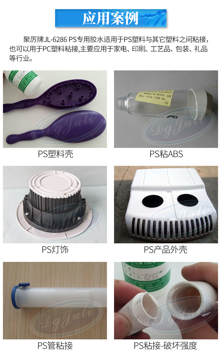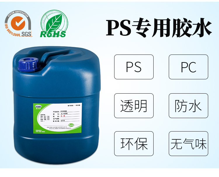 聚力PS专用胶水是一款单组分全透明.无需表面处理.5-10分钟快速定位,低气味.环保型产品,专门针对PS与PS、PS与ABS、PVC等材料自粘或相互间的粘接。常温使用操作方便。对PS粘接无需处理、快速固化.优良的耐水性能,有较高的附着力.完全固化后有较好的防水性,主要应用于家电、印刷、工艺品、包装、礼品等行业.完全固化需24小时,是一款慢干型的产品,适合单面涂胶,双面涂胶效果会更好。