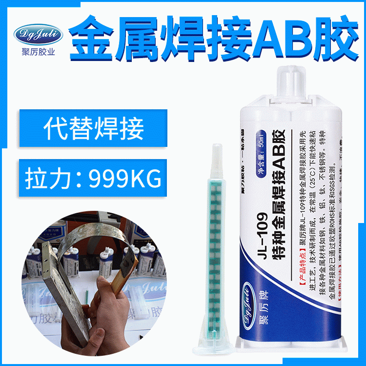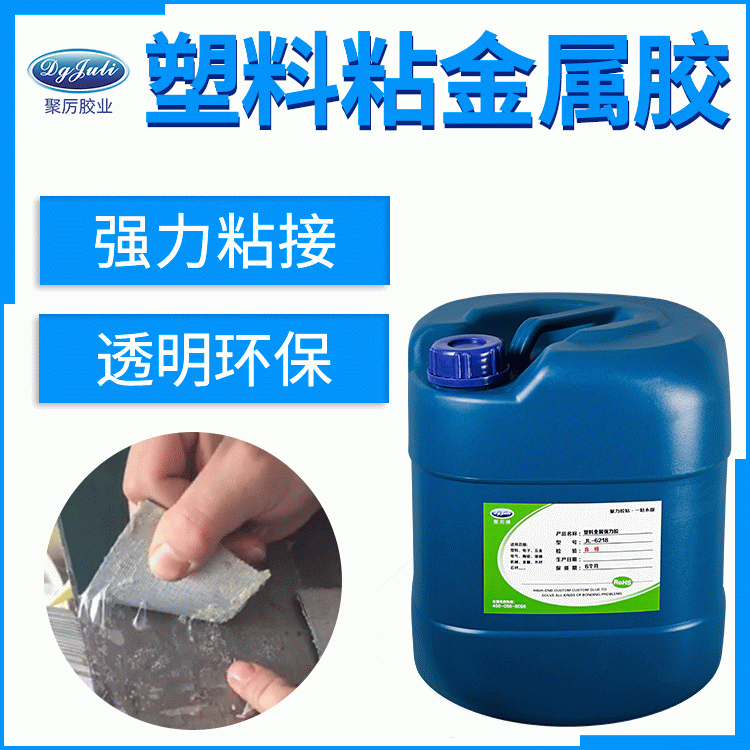 聚力塑料粘金属胶水为单组份.新型全透明溶液胶,双面涂胶,初粘力好,可立面施胶,室温固化,操作方便,具有强度高、高弹性、胶膜柔软、耐水、酸、碱性能好,可用于金属板材与皮革、布、塑料、海绵等材质的粘接。本产品符合标准,通过欧盟ROHS检测和无卤认证.对于不锈钢、铁、铝等金属与ABS、PVC、PC、木材、皮革、布料等材质大面积粘接具有很好的粘接强度,初粘力好,可立面施胶,具有的耐寒、耐老化、耐酸碱等优点