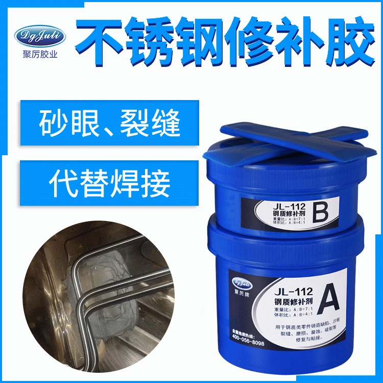 聚力不锈钢修补剂则是一种特种冷焊修补材料,膏状不流淌,主要功能是用于修复不锈钢表面的裂缝、砂眼、磨损、气孔等缺陷,因其粘接强度可以达到冷焊的效果,并且可以涂在不锈钢表面起防锈涂层的作用,也可用于部分有特殊要求的不锈钢材质的粘接,固化后还可以打磨抛光,密封效果及好,耐高温168度,耐温性及耐酸碱、耐溶剂、耐油防水性能优异。