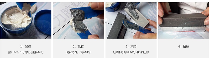 2、涂胶:聚厉牌JL-101铸铁管道修补剂 是由A、B双组份组成,使用时严格按规定的配合比将主剂A和固化剂B充分混合到颜色均匀一致,并在规定的可使用时间内用完,剩余的胶不可再用;