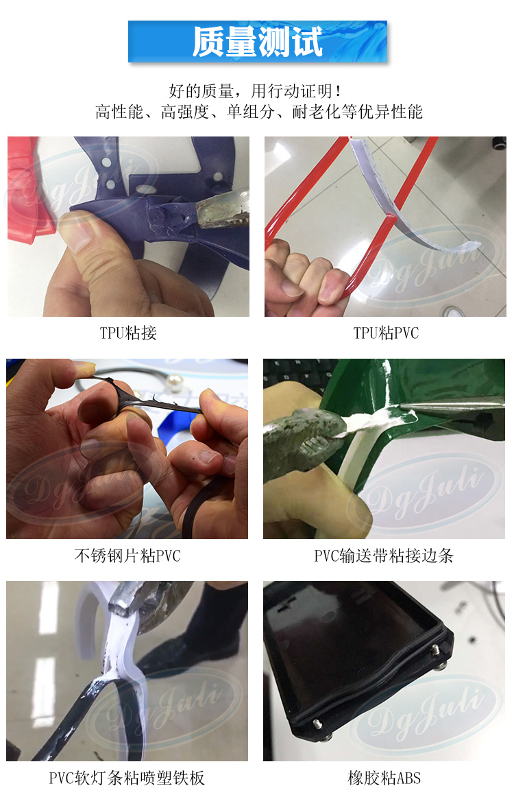 聚厉PVC快干胶适合于小面积的PVC粘接,更可用于TPU.TPR.PP..ABS.硅胶.橡胶.PC.PS.AS.PPS.EVA.PET.皮革等柔韧性材质,通用型比较广,是一款单组分的专用胶粘剂。采用了5-8的快速定位,为小面积的粘接提供有效.快捷的粘接效果。小面积粘接,大多数人都担心白化这个问题,聚厉PVC快干胶在满足粘接的强度同时也能满足低白化的现象。广泛应用于软性塑料类的粘合(如:软PVC、TPU、TPR、橡胶、ABS、HIPS、人造橡胶、搪胶、弹性塑胶等材质的粘接,固化快,固化后有韧性,粘合力强,粘接后可达到两粘接面溶为一体的效果