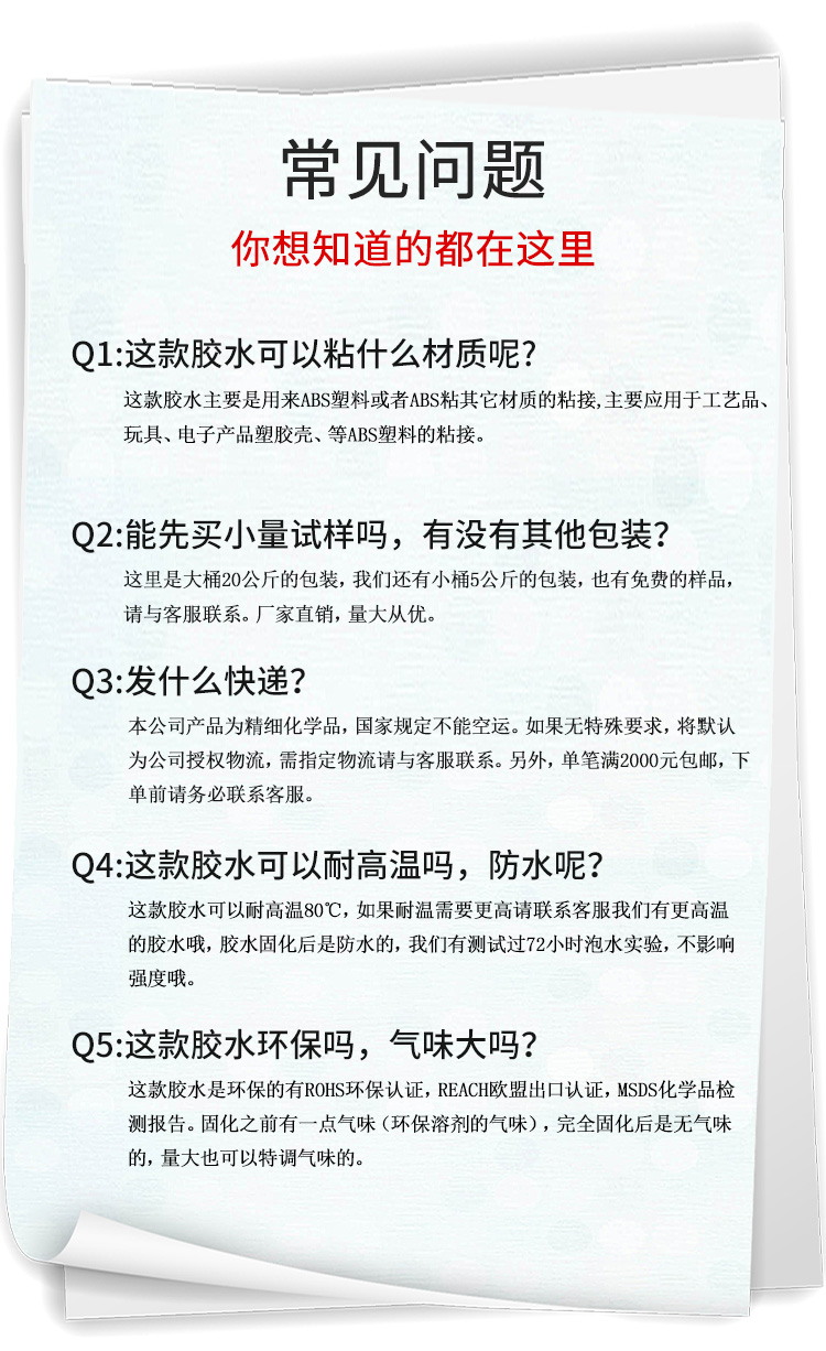 聚厉ABS塑料专用粘合剂,是一款新型环保油性胶粘剂,适用ABS与PC,PS等材料粘合,经过数次调整适合浓度适中,人工涂胶不费力,轻松高效,机器喷胶顺畅不会堵住喷口。适合大面积的ABS粘合,5-8分钟快速定位,让粘接效率极大的提高,24小时固化后可达到