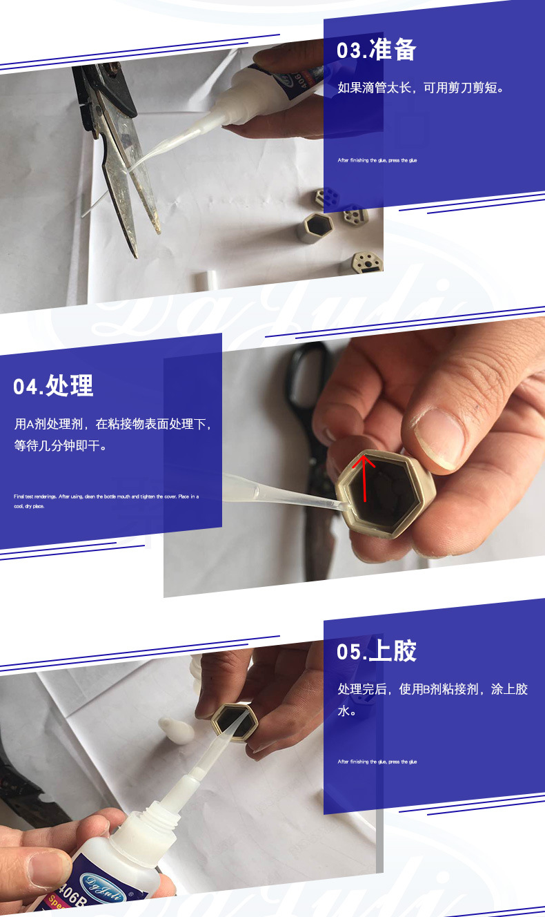 3.A剂是PP处理剂。B剂是PP粘接剂,AB配和使用效果更好。可先用406APP处理剂先处理一下PP材质表面,待表面干透后,再滴一小滴406BPP瞬间胶水,即刻进行粘接按压,并保持到固化为止,硬化时间数秒不等。PP瞬间粘合剂约30分钟即可达到实用强度