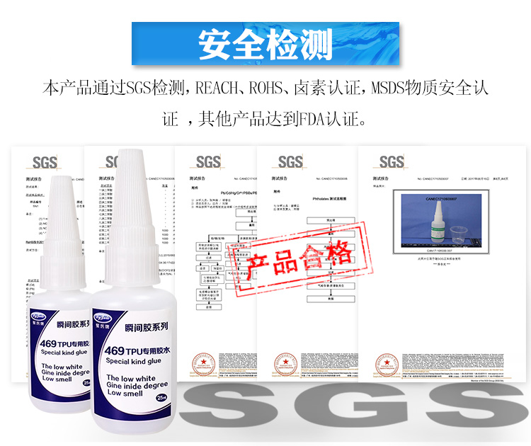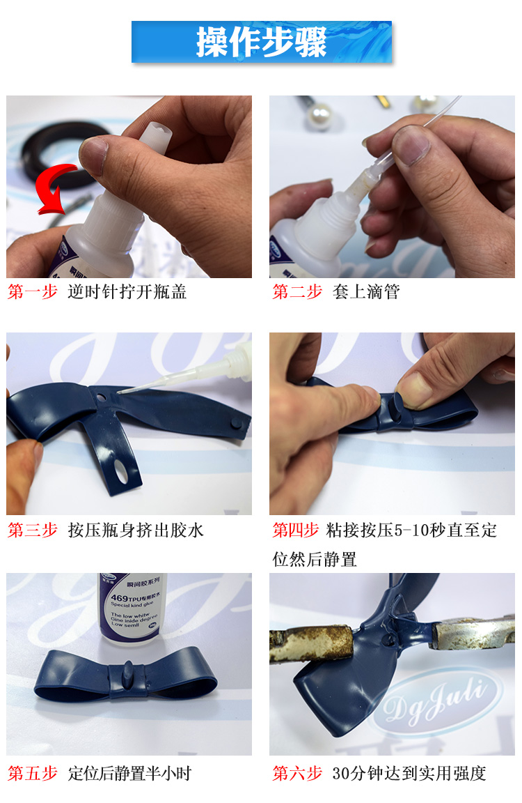 3.使用聚厉PVC塑料专用快干胶粘接好的塑料件,如果需要测试性能,建议完全固化24小时以后再进行测试;完成粘接后的塑料件,在24小时以后再进行密封包装,否则容易引起白化现象;如果出现了白化现象,可以用棉签沾上聚力胶水的瞬间胶解胶剂擦拭掉;