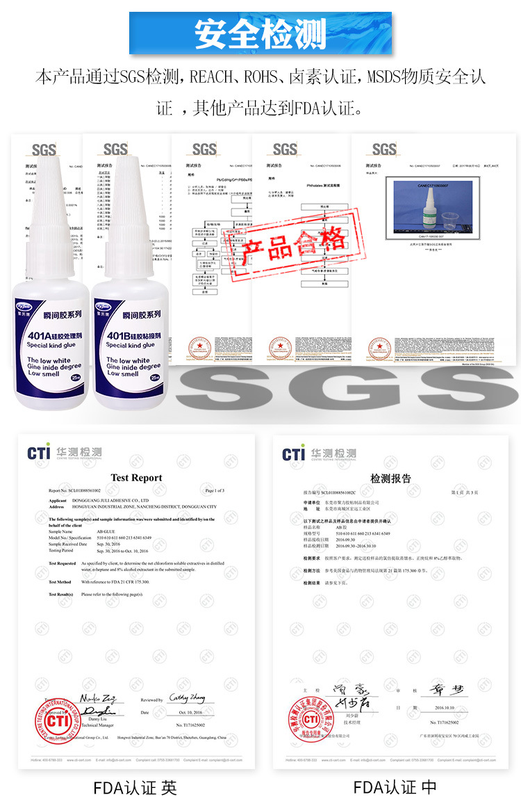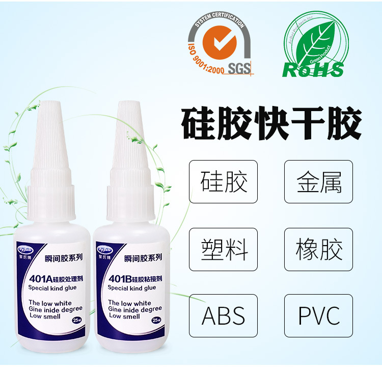 使用JL-401PVC粘硅胶胶水粘硅胶和PVC塑料之前,先要用干绵布或砂纸将硅胶和塑料表面的灰尘、油污、锈迹等除去,清洁接着表面,增强硅胶专用瞬间胶水的附着力度。拧开前盖,即可使用,瓶口如有硅胶瞬间胶水的先用绵布擦拭干净,再可套上针头或PE滴管后使用,先用A剂硅胶处理剂处理硅胶表面,稍为等待几秒,再在其中的一个表面滴一小滴或拖一条线的B剂硅胶瞬间胶水,即刻进行粘接,并保持数5-8秒即可完成定位。30分钟左右即可达到使用强度,24小时后完全固化。