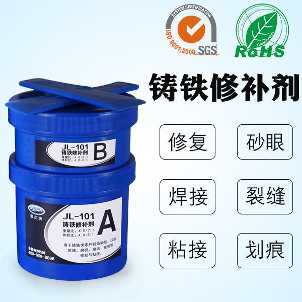 使用JL-101铸铁气孔修复胶修补之前,先要停止运行,保证修补的过程中不会有渗漏,然后用打磨工具将渗漏部分的锈迹、污渍等打磨掉,并要适当扩大打磨区域,再按重量比2:1取适量的铸铁修补剂混合均匀(一次性混胶在10克左右),然后涂抹于需要修补的部位,并用硬质工具刮平并反复按压,使铸铁气孔修复胶能挤进细小的孔隙中,起到填充的效果,完成修补后的铸铁,至少要12小时之后才能投入使用。聚厉牌铸铁气孔修复胶为膏状,不流淌,以金属粉为强化填充剂,固化后具有优异的机械性能,可进性钻孔、车牙、切削、砂磨及攻丝等各种机械加工;无收缩,在不允许动火电焊的工作环境可取代电焊进行冷焊修补。