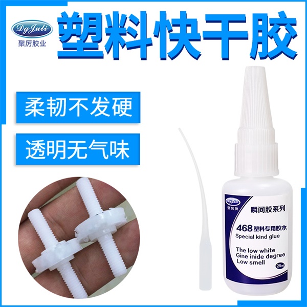 小面积的ABS塑料粘接可以使用ABS塑料专用瞬间胶水JL-468ABS塑料专用瞬间胶水是一款单组分无白化快干型胶粘剂,属于丙烯酸酯胶粘类型,胶水呈透明状,粘度很低,但是粘性很强,能牢牢锁住基材,可与基材融为一体的的效果。环保,基本无气味的设计,在空气不畅通的空间,也不会散发出让施工人员不适的气味。用于粘接TPU、TPR、PP、PVC、ABS、硅胶、橡胶、PC、PS、AS、PPS、EVA、PET、皮革等柔软的材质,用途广,防水,粘接强度高,可达到破坏基材胶水不脱落的强度,5-8秒定位,低白化低刺激性气味,流动性好,粘接面积越小强度越高,半小时左右就可以达到使用强度,完全固化后可达到破坏ABS塑料而胶不脱落的效果。配合对应的处理剂用于ABS与PP、硅胶等难粘材质也有很好的强度,通过欧盟REACH194项环保检测,符合国际环保标准。