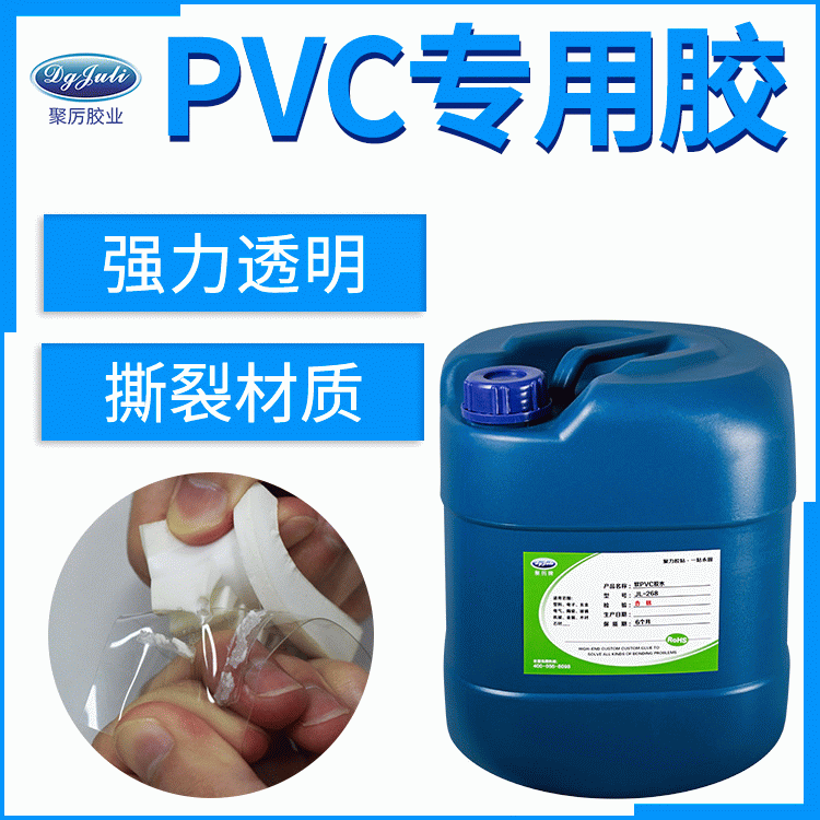 PVC塑料胶水厂家东莞聚力为PVC板或卷材与其他塑料粘接而开发的PVC塑料胶水,单组份,全透明高浓度聚氯乙烯PVC粘合剂,定位时间为5-8分钟,有着充足的时间来完成操作,高浓度有着良好的处粘性和强大的粘接力,耐老化,环保气味低,用途较广,常常用于PVC、ABS、PET、AS、PU、PC等软质塑料的粘接,具有耐水泡、抗弯曲、抗腐蚀的效果。广泛用于塑料制品、电子电器、塑料玩具、运动用品等行业中PVC材料以及软性塑料材质的粘接,效果可以达到撕裂材质的效果。符合标准通过欧盟ROHS检测和无卤认证。