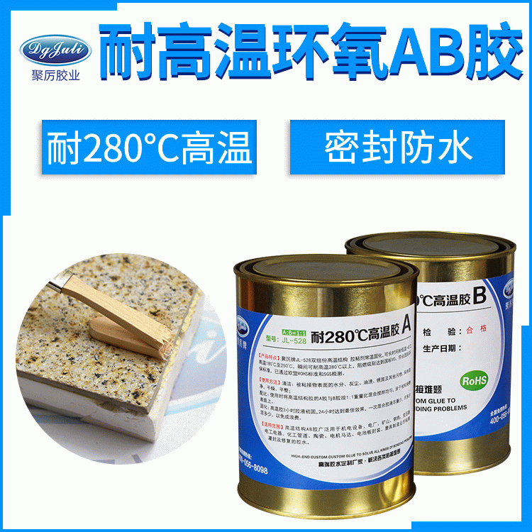 东莞聚力耐高温金属专用环氧AB胶符合环保标准,已通过欧盟ROHS标准和SGS检测, 是引进国外的工艺技术及进口原材料配制而成的双组份环氧树脂胶粘剂。比例为1:1,耐油、耐水、耐酸碱、耐磨、防腐性良好,等优越性能;常温固化,可长时间耐低温-60℃高温180℃到250℃,瞬间可耐高温280℃以上,阻燃级别达到国标VO。可操作时间为30分钟左右,定位时间为60分钟,有充裕的时间来完成施工和调整。