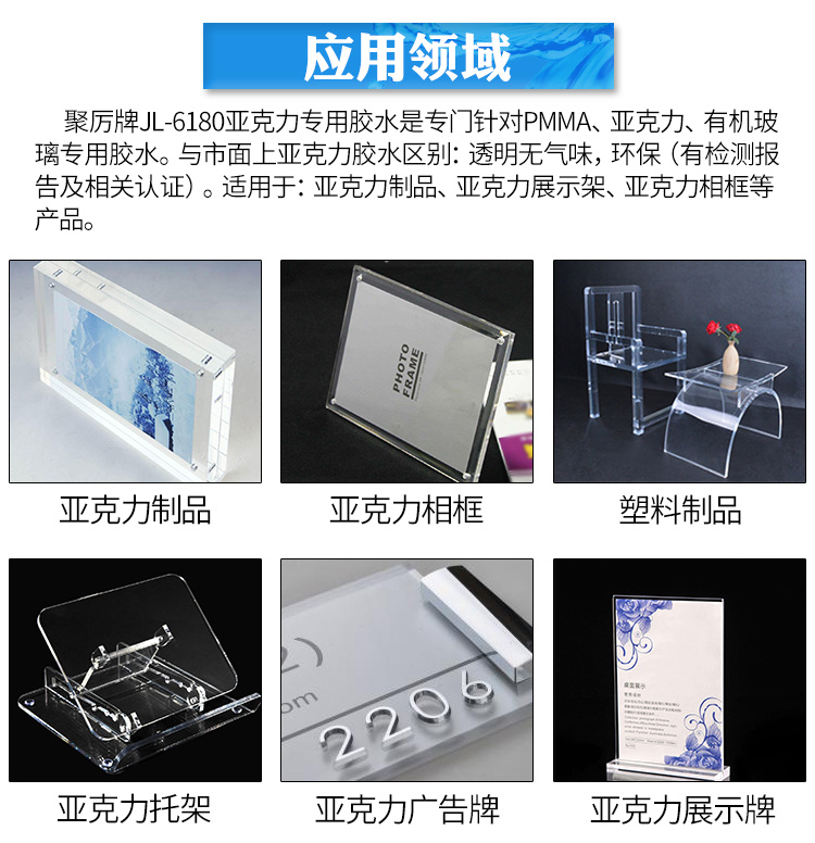 东莞聚力JL-6180亚克力专用胶水是单组份新型全透明溶剂胶,解决了其他系列胶水粘接压克力时发白和难粘接的问题;室温固化操作方便,具有高强度,高弹性,胶膜柔软,耐水,耐酸碱性能好,长期储存不变质等优点,广泛用于于家电工业,亚克力制品、无线通信工业,工艺玩具,保温材料,装潢广告,包装印刷等行业理想粘接剂符合环保标准,已通过欧盟ROSH标准和SGS检测。