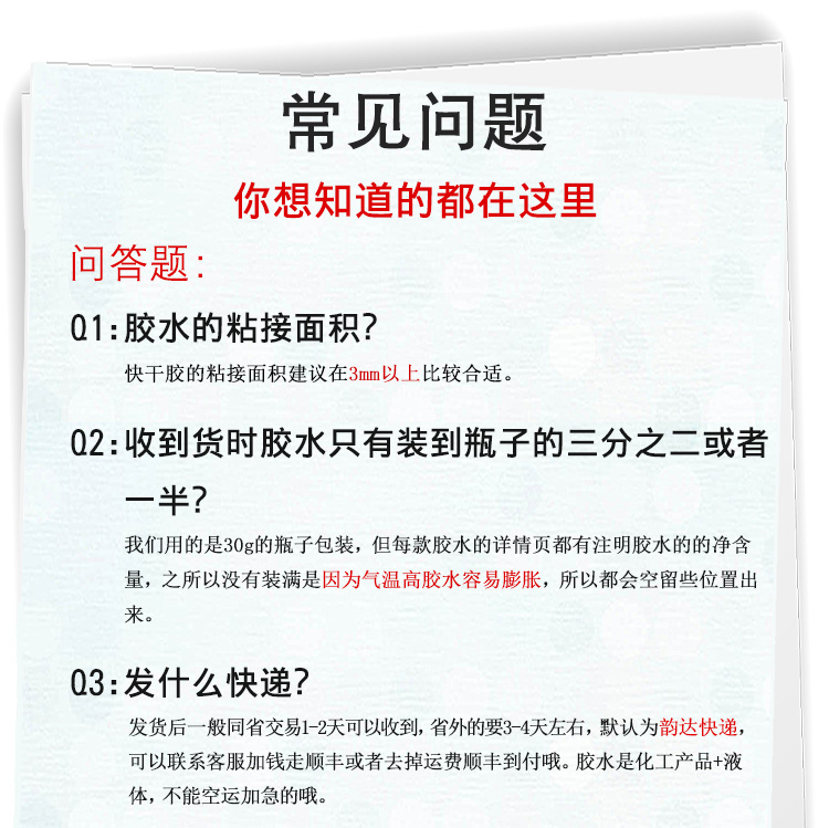 粘接断裂金属发饰前,请先用干绵布或砂纸将接着面的灰尘、油污、铁锈等除去,清洁接着表面,增强胶水附着力。拧开前盖,即可使用,瓶口如有胶水先用绵布将胶水擦拭干净,再可套上针头或PE滴管后使用,得以控制胶水流量,保证粘接的效果。在被接着面滴一小滴金属断裂修补胶,即刻进行粘接,并保持到硬化为止,硬化时间数秒不等。金属瞬间胶约30分钟即可达到使用强度,24小时后粘接效果更佳。使用后清理瓶口,并将盖子旋紧。使用完毕请将没用完的胶水存放在阴凉干燥处。