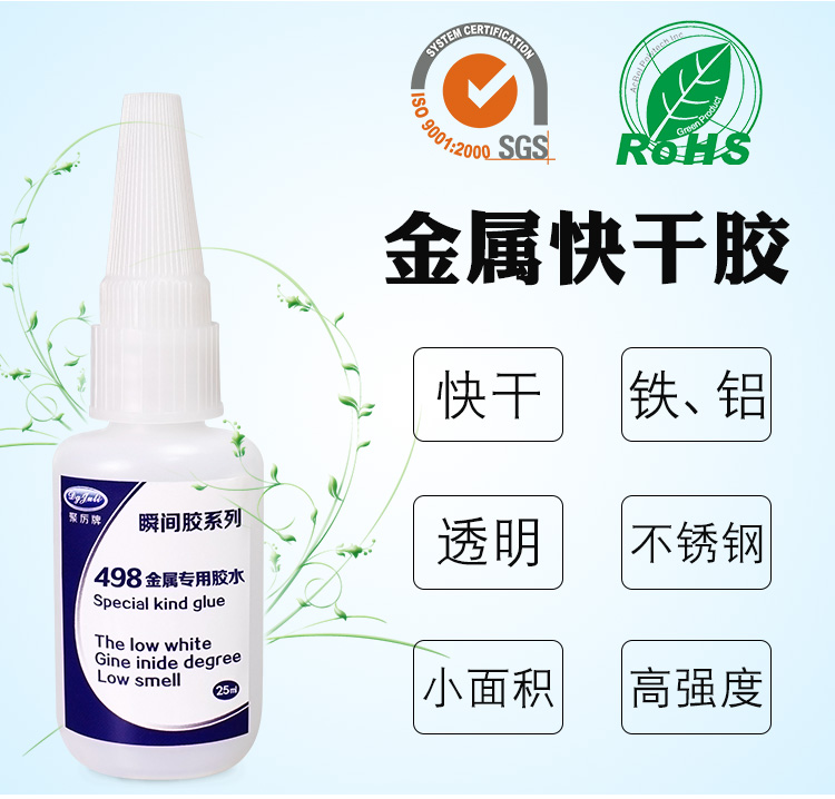 聚厉牌JL-498金属断裂修补胶主要成份氰基丙稀酸酯, 符合环保标准,已通过欧盟ROHS标准和SGS检测,水为氰基丙烯酸甲酯,甲基系列是为金属小面积粘接所需要的高强度而设计的单组分瞬间粘接剂,具有高性能、高强度、单组分、耐老化等优异性能,非常适合连续化生产线作业。