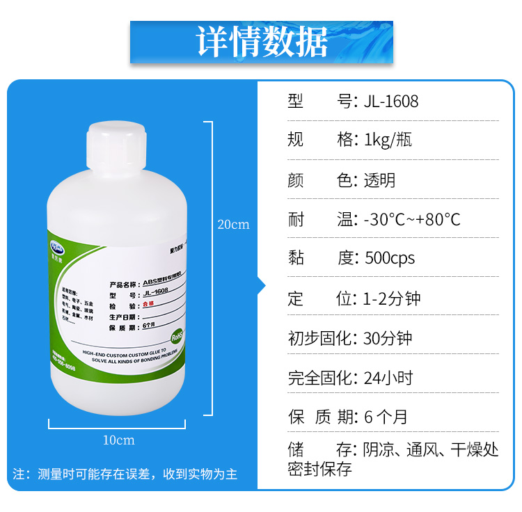聚厉牌JL-1608ABS塑料快干胶是专门针对ABS塑料粘合的专用胶粘剂。本产品符合标准,通过欧盟ROHS检测和无卤认证。主要应用于ABS、PS、AS、PVC、PC等工程塑料的粘接。广泛应用于电子产品塑胶壳、儿童玩具、体育用品、医疗产品等塑料制品有很好粘接强度。