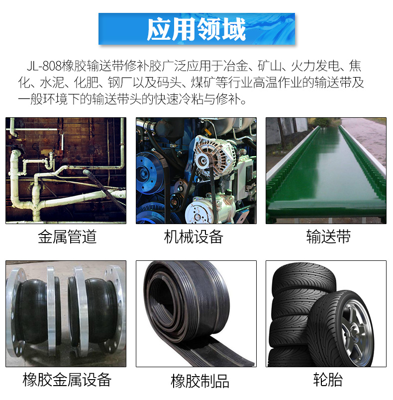 橡胶输送带是常见的输送带种类,主要用于矿山、冶金、煤矿、水电等行业。橡胶输送带价格说贵也是不很贵,但也不便宜,如果出现损坏就直接扔掉就很浪费了,修修还是能用的。那么,橡胶输送带损坏该怎么修?建议您用橡胶输送带修补剂试试。聚厉牌JL-808耐高温橡胶修补剂是双组份室温固化、高性能氯丁胶。具有很强的初粘力和终粘强度,耐高温性能好。能满足150℃环境下输送带接头的快速粘接和修补。具有性能稳定,干燥迅速,易操作,耐老化,耐酸、碱、盐、水、油等性能。