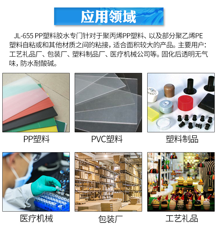 JL-655PP塑料专用胶水主要应用于PP与PP、ABS、PVC、尼龙、TPU、EVA、竹木、石材等材料的粘接,无需前处理。广泛应用于家电、印刷、工艺品、制刷、喇叭、包装、礼品等行业。