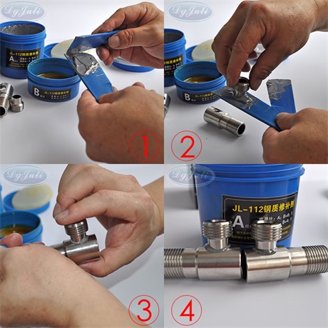 产品特性: 聚厉牌JL-112耐高温铸钢修补剂系列产品是以改性高分子树脂为主体,以金属及合金为强化填充剂的聚合金属复合型冷焊修补材料,固化后具有优异的机械性能,可进性钻孔、车牙、切削、砂磨及攻丝等各种机械加工.形状为膏状,不流淌,用于缺陷的各种铸件气孔、缩孔、砂眼、裂纹等缺陷的修补,修补后与被基体颜色基本一致,可用于低温潮湿环境下施工操作,也可加温50-60度加速修补剂的固化速度