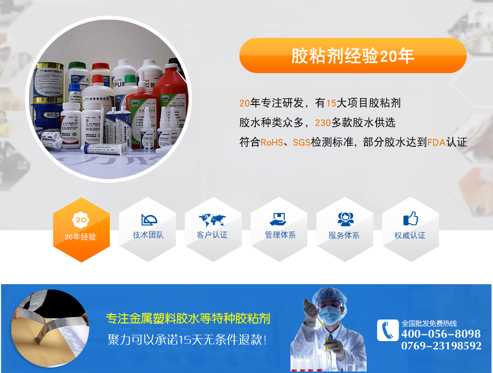 选择聚力公司,让聚力公司以优异到位的服务宠坏每一个客户!了解更多胶水应用方案情况,欢迎点击http://www.juli88.com/咨询客服或拨打或直接拨打全国免费服务热线400-056-8098以及0769-23198592,期待您的来电来访!聚力胶粘公司将免费为您提供样品,免费进行试样服务,免费提供解决方案,期待您试用满意后再下订单,为您竭诚服务是胶水厂家聚力一贯秉承的宗旨!