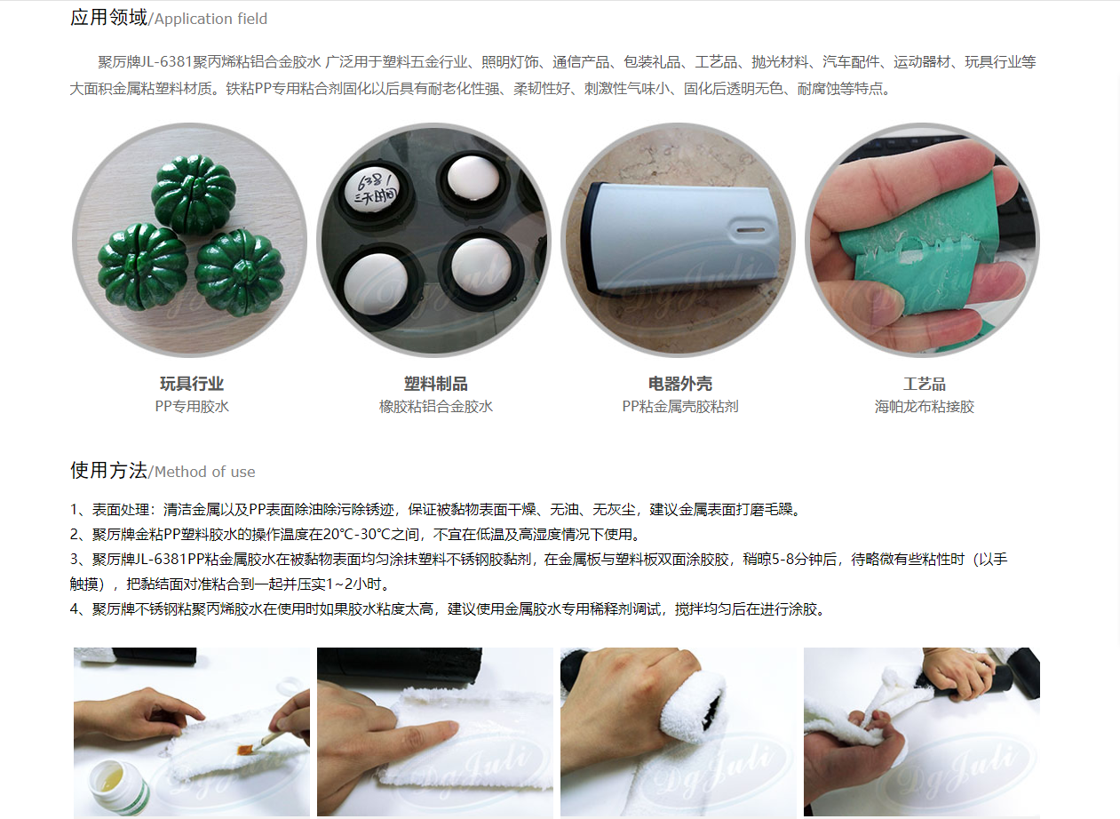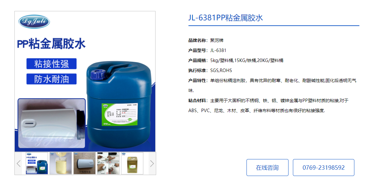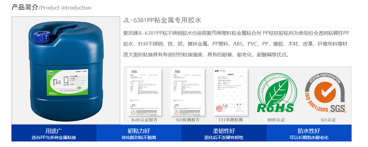 - 温馨提示:以上是关于PP粘金属胶水|密度小强度刚度硬度优异+不结垢使用寿命长[聚力]的相关知识,产品由聚力胶水厂家提供,20多年品牌,数百款产品,满足不同行业、不同材质、不同工艺、不同客户的需求,可以根据您的需求量身定制。