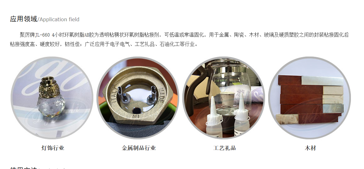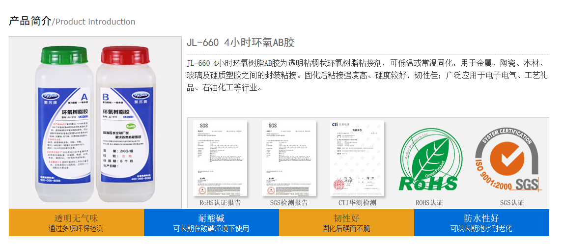 江苏省苏州市客户王经理打电话给AB胶厂家东莞聚力胶粘公司,他说自己正在找一款室温固化较长工作时间,有一定防火性能的环氧树脂AB胶,要求特别适用于电器,玩具,五金,饰品,塑胶,木材,皮革等材质的粘接。聚力公司推荐了聚厉牌JL-660 4小时环氧树脂AB胶,这款AB胶为透明粘稠状环氧树脂粘接剂,可低温或常温固化,用于金属、陶瓷、木材、玻璃及硬质塑胶之间的封装粘接。广泛应用于电子电气、工艺礼品、石油化工等行业。聚厉牌4小时环氧AB胶符合环保标准,已通过欧盟ROHS标准和SGS检测。固化后粘接强度高、硬度较好、韧性佳、耐酸碱性能好、防潮防水、防油防尘性能佳、耐湿热和大气老化、具有良好的绝缘、抗压等特性。现将聚厉牌4小时环氧AB胶简单介绍如下: