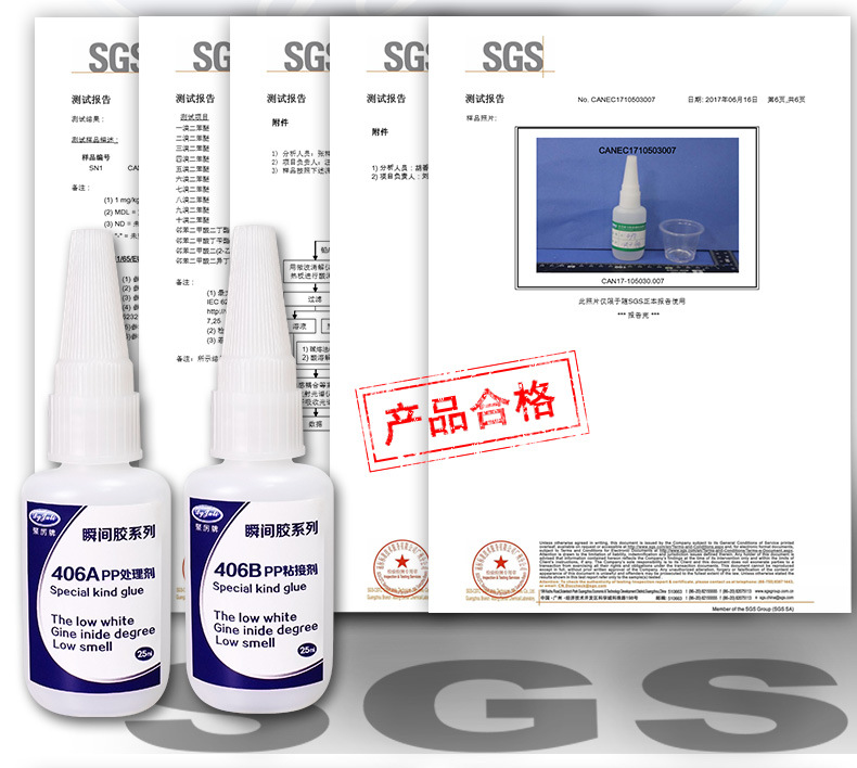 3.A剂是PP处理剂。B剂是PP粘接剂,AB配和使用效果更好。可先用406APP处理剂先处理一下PP材质表面,待表面干透后,再滴一小滴406BPP瞬间胶水,即刻进行粘接按压,并保持到固化为止,硬化时间数秒不等。PP瞬间粘合剂约30分钟即可达到实用强度