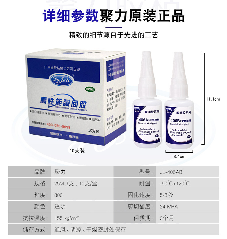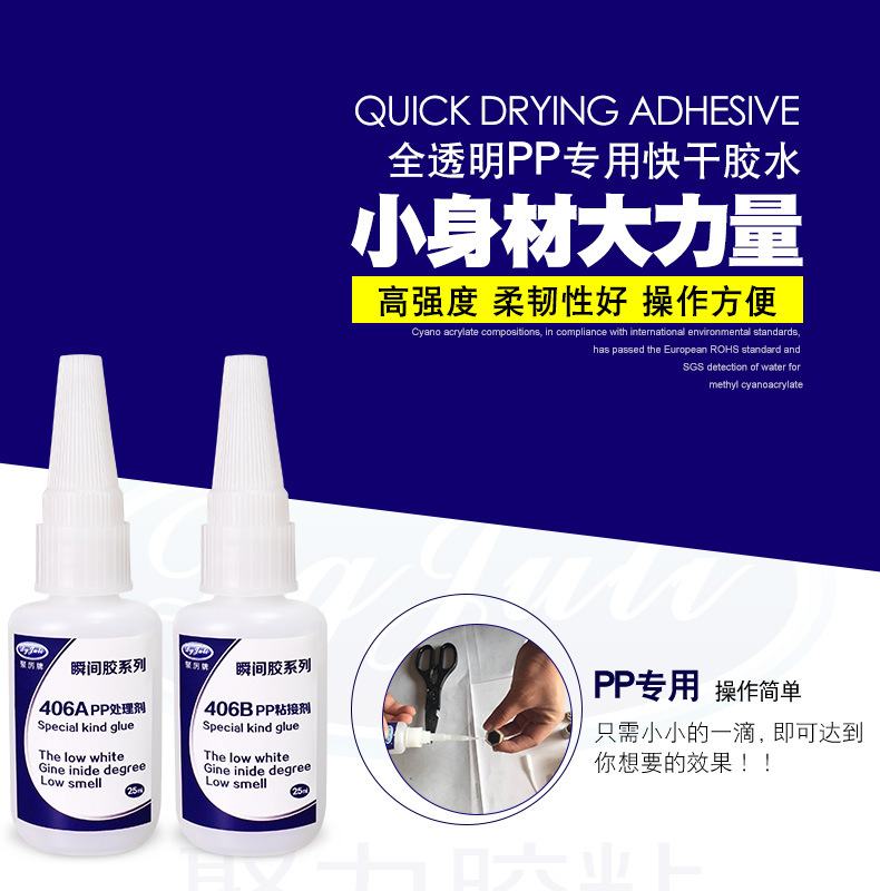 3.本款:A剂是PP处理剂。B剂是PP粘接剂,AB配和使用效果更好。可先用JL-406APP处理剂先处理一下PP材质表面,再滴一小滴JL-406BPP瞬间胶水,即刻进行粘接按压,并保持到硬化为止,硬化时间数秒不等。PP瞬间粘合剂约30分钟即可达到实用强度,24小时后可达到完全强度。
