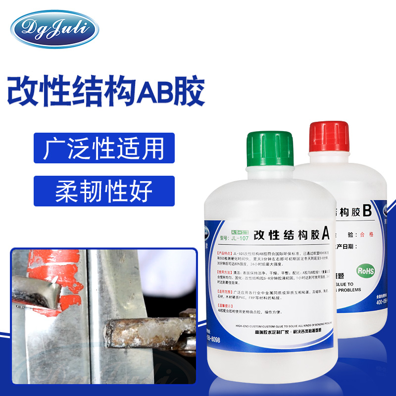 聚厉牌JL-107金属结构AB胶属于改性丙烯酸酯胶粘剂,采用国外工艺技术研制而成,符合环保标准,已通过欧盟ROHS标准和SGS检测。在常温(25℃)下能粘各类金属,磁铁,陶瓷,石材,木材,硬质PVC,FRP等.使用方便,具有广泛的适用性,固化后胶膜韧性好,抗冲击及剪切力强、耐候性佳。广泛适用于金属制品、塑料制品行业、机电行业、化工管道、汽车水箱、油箱、电梯行业。