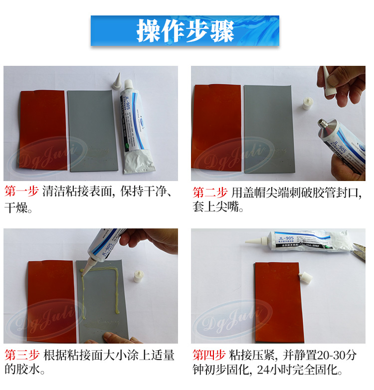 使用电子电器灌封胶水前产品表面处理:清洁金属表面,除油除污除锈迹,保证被黏物表面干燥、无油、无灰尘,建议金属表面打磨毛躁。聚厉牌粘硅胶胶水操作温度在20℃-30℃之间,不宜在低温及高湿度情况下使用。玻璃专用密封胶被黏产品物表面均匀涂抹密封胶水,单面打胶或者是点胶胶马上把粘结面对准粘合到一起并压实1~2小时达到一定强度。聚厉牌粘铁密封胶水,操作完成后未用完的胶应立即拧紧盖帽,密封保存再次使用时,若封口处有少许结胶皮,将其去除即可不影响正常使用。