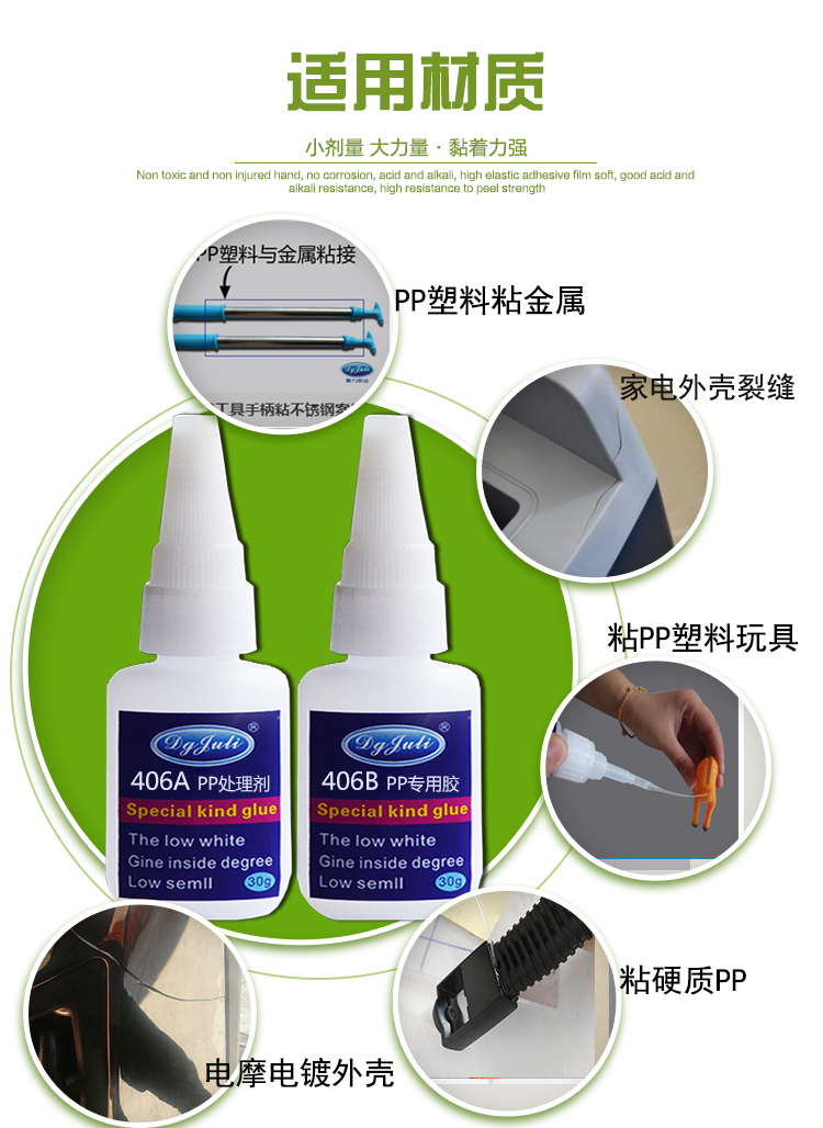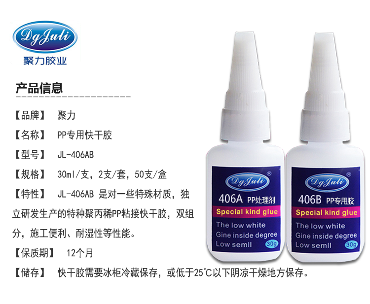 JL-406AB剂双组份PP胶水符合环保标准,通过欧盟ROHS标准和SGS检测,对一些特殊材质,自主研发生产的特种瞬间胶粘剂,双组分,施工便利。非常适合连续化生产线作业。具有高性能、高强度、柔韧性好、耐湿性等性能。