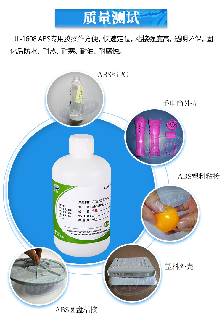 聚厉牌JL-1608ABS粘PET胶水是专门针对ABS塑料粘合的专用胶粘剂。本产品符合标准,通过欧盟ROHS检测和无卤认证。主要应用于ABS、PS、AS、PVC、PC等工程塑料的粘接。广泛应用于电子产品塑胶壳、儿童玩具、体育用品、医疗产品等塑料制品有很好粘接强度。