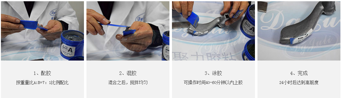 2、涂胶:聚厉牌钢质修补剂是由A、B双组份组成,使用时严格按规定的配合比将主剂A和固化剂B充分混合到颜色均匀一致,并在规定的可使用时间内用完,剩余的胶不可再用;