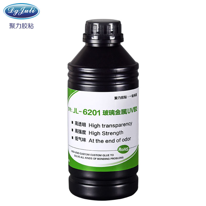 聚厉牌JL-6201玻璃粘金属UV胶水属于丙烯酸酯类胶粘剂采用进口原材料,应用于金属与玻璃、塑料与玻璃、陶瓷与玻璃、玻璃与玻璃、水晶工艺品与玻璃、强度比市面上大多数UV胶有40%以上提高透明度以及强度,等透明塑料材质的粘接有很好的耐腐蚀性好,耐酸碱,耐老化、抗震动等优点。