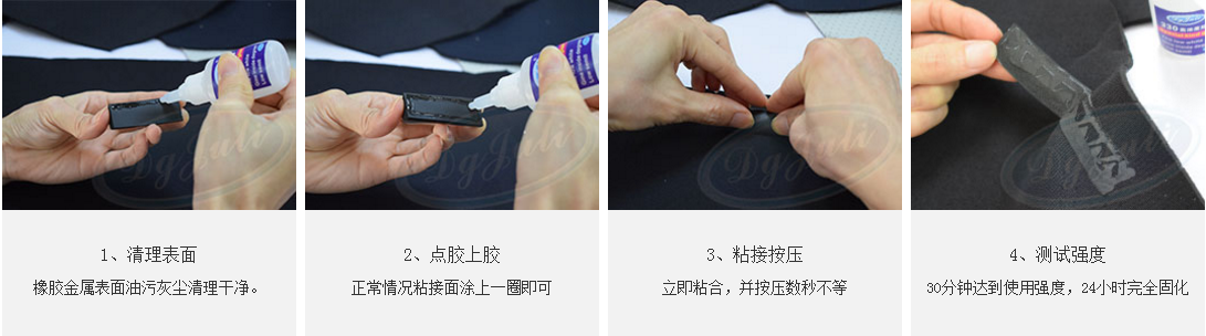 3、在被接着面滴一小滴橡胶粘金属瞬间胶,即刻进行粘接,并保持到硬化为止,硬化时间数秒不等。橡胶粘金属快干胶水约30分钟即可达到使用强度,24小时后粘接效果更佳。